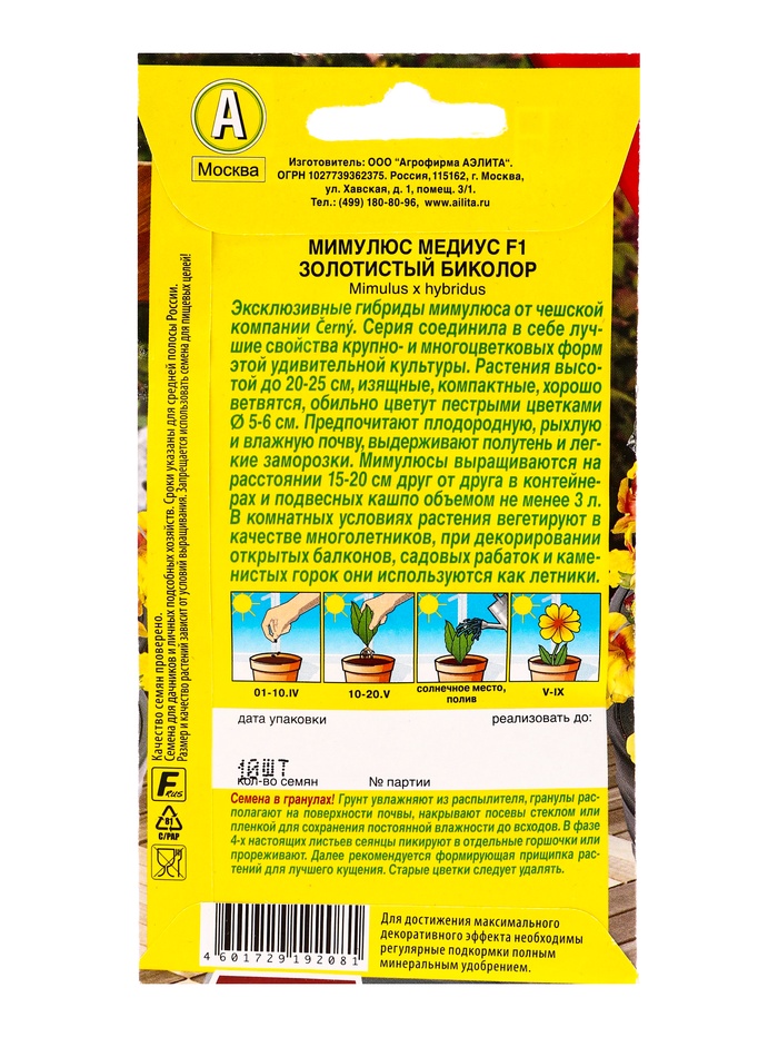 Технические характеристики Семена цветов Мимулюс Медиус F1 золотистый биколор (драже) С. Cerny Цветущий балкон, Ц/П,10 шт. 1094