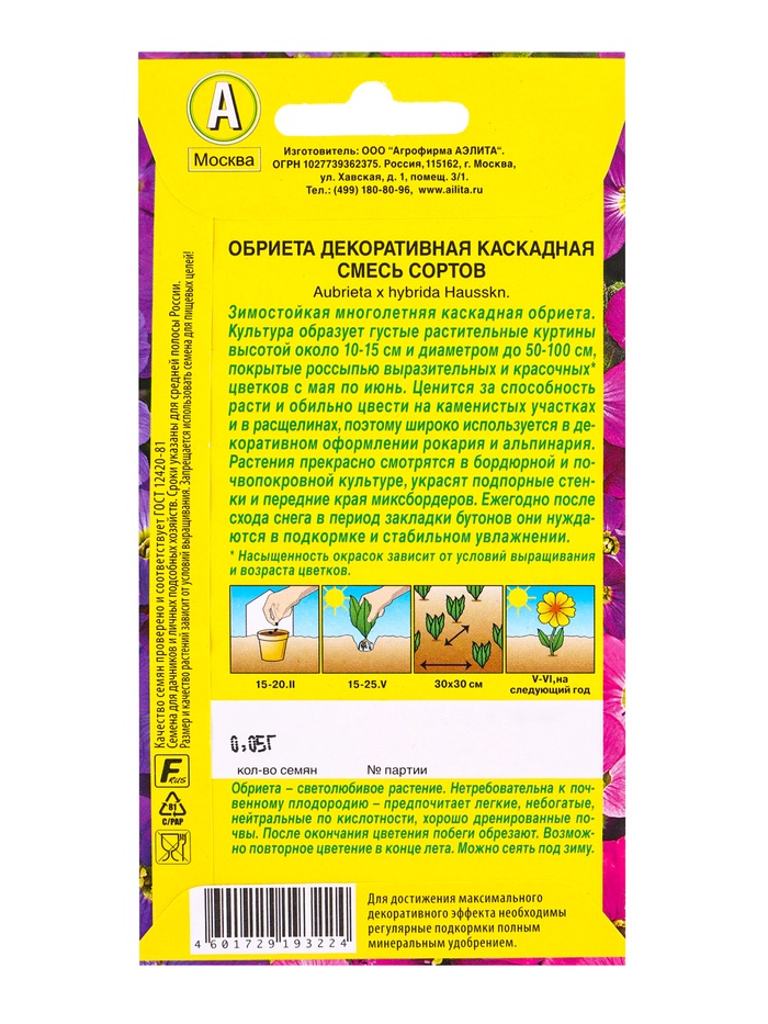 Семена цветов Обриета Декоративная каскадная, смесь сортов Мн, Ц/П,0,05 г