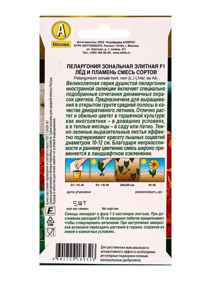 Технические характеристики Семена цветов Пеларгония Элитная F1 лёд и пламень, смесь сортов Мн Золотая серия, Ц/П,5 шт.