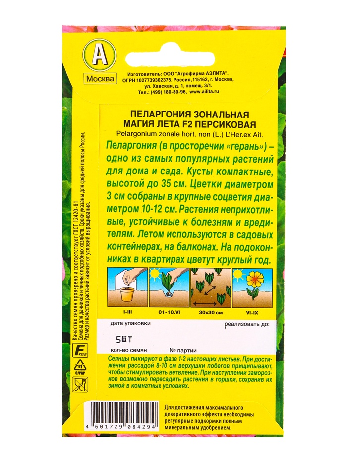 Технические характеристики Семена цветов Пеларгония Магия лета F2 персиковая Мн, Ц/П,5 шт.