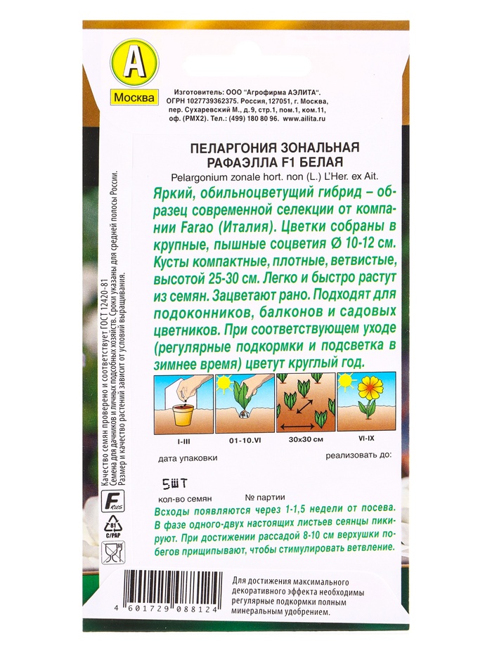 Технические характеристики Семена цветов Пеларгония Рафаэлла F1 белая Мн С. Farao Золотая серия, Ц/П,5 шт.