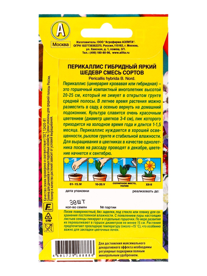 Технические характеристики Семена цветов Перикаллис Яркий шедевр, смесь сортов Мн Цветущий балкон, Ц/П,30 шт.