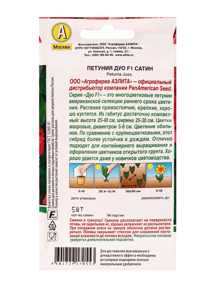 Технические характеристики Семена цветов Петуния Дуо F1 сатин (драже в пробирке) Спецсерия PanAmerican, Ц/П,5 шт.