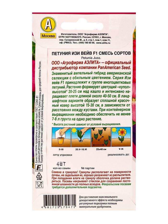 Технические характеристики Семена цветов Петуния Изи вейв F1, смесь сортов (драже) PanAmerican Wave, Ц/П,4 шт.
