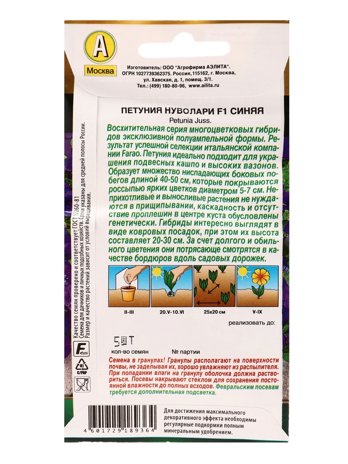 Технические характеристики Семена цветов Петуния Нуволари F1 полуампельная синяя (драже) С. Farao , Ц/П,5 шт.