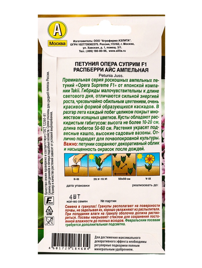 Технические характеристики Семена цветов Петуния Опера суприм F1 распберри айс ампельная (драже) С. Takii Seed , Ц/П,4 шт. 1094