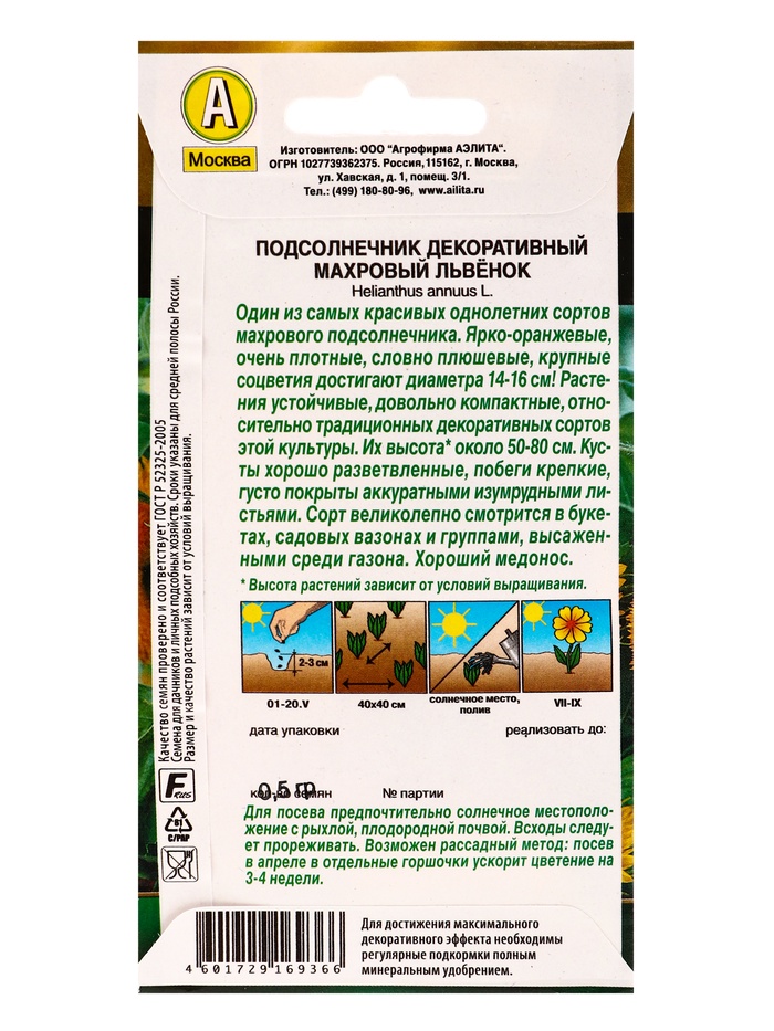 Семена цветов Подсолнечник Махровый Львенок Золотая серия, Ц/П,0,5 г