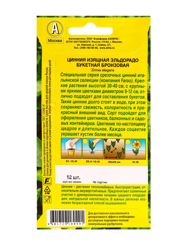 Технические характеристики Семена цветов Цинния Эльдорадо букетная бронзовая С. Farao, Ц/П,12 шт.