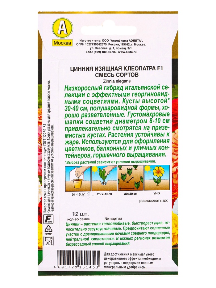 Технические характеристики Семена цветов Цинния Клеопатра F1, смесь сортов Золотая серия, Ц/П,12 шт.