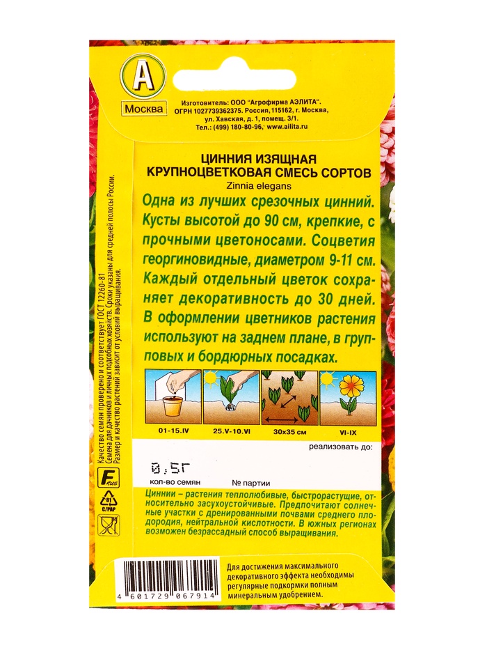 Семена цветов Цинния Крупноцветковая, смесь сортов , Ц/П,0,5 г