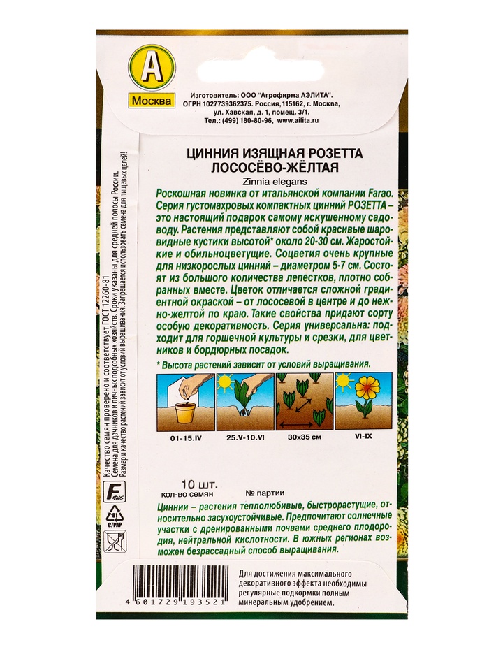 Технические характеристики Семена цветов Цинния Розетта лососево-желтая Золотая серия, Ц/П,10 шт.