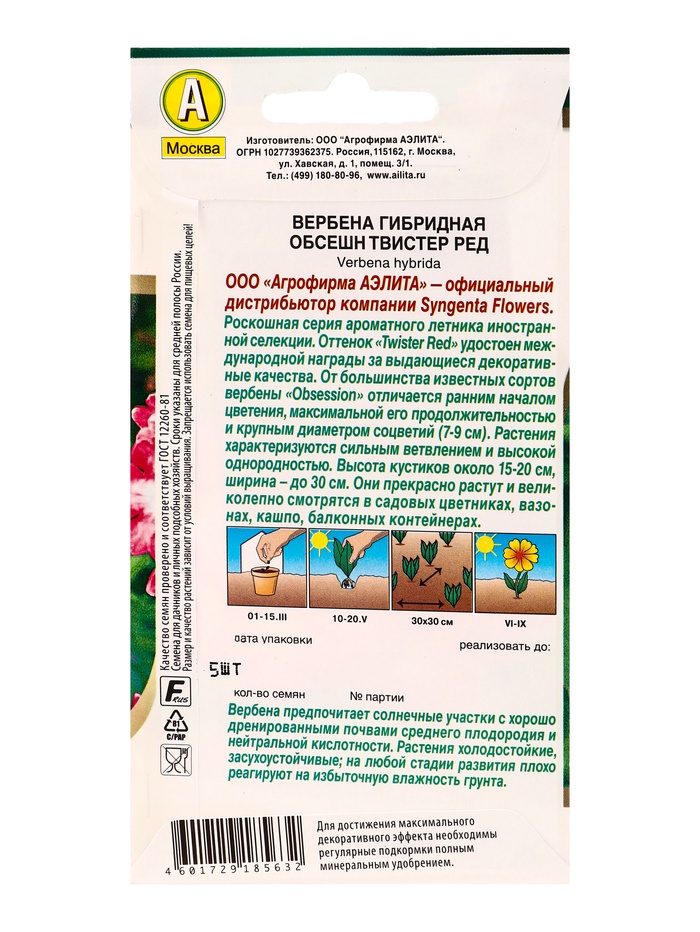Технические характеристики Семена цветов Вербена Обсешн твистер ред Спецсерия Syngenta, Ц/П,5 шт.