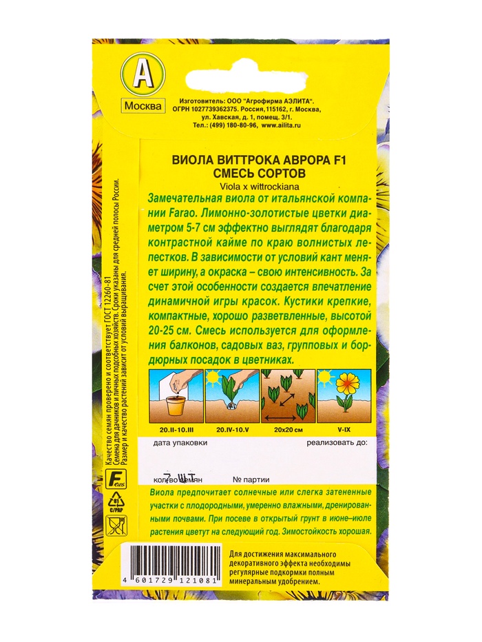 Технические характеристики Семена цветов Виола Аврора F1, смесь сортов Дв С. Farao, Ц/П,7 шт.