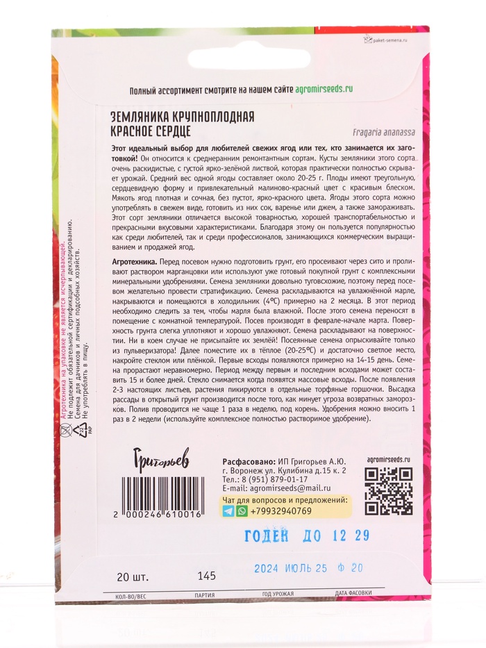 Технические характеристики Семена цветов Земляника Красное Сердце крупноплодная 20шт. 12.29 г.