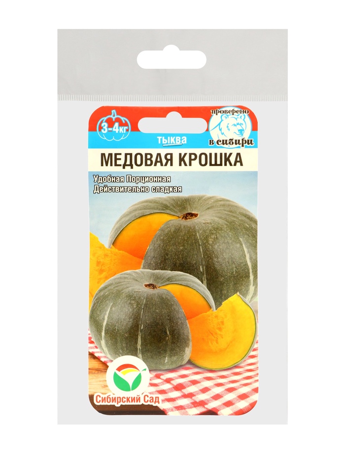 Среднеспелый кустовой сорт. Период от полных всходов до уборки урожая занимает 120-130 дней. Сорт удобный, порционный, вес плодов не превышает 3-4 кг. Вкус занимает достойное место в ряду самых сладких сортов тыквы. Возможно, попробовав раз, вы уже никогда не захотите расстаться с «Медовой Крошкой», она займет почетное место на вашем участке. Растение средней мощности, среднеплетистое. Плод плоско-округлый, светло-серой окраски. Мякоть ярко-желтая, толстая, плотная, сладкая, с высоким содержанием сухих веществ и саха¬ров. Вкусовые качества отличные, хорошо хранится. Плоды предназначены для всех видов переработки. Урожайность достигает 5-8 кгм2. Сорт ценится за стабильную урожайность, выровненность плодов, лежкость. Устойчив кантракнозу. Выращивается как рассадным способом, так и прямым посевом в грунт. Посев на рассаду в апреле, высадка рассады в грунт в мае - июне. Посев непосредственно в грунт в конце мая - июне. Хорошо отзывается на внесение органических удобрений.