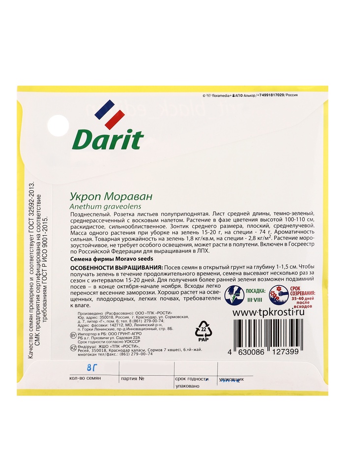 Технические характеристики Семена Укроп Мораван Дарит Black Edition 8 г (80)