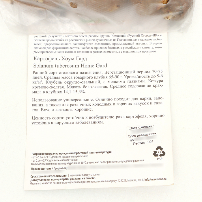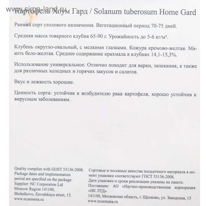 Технические характеристики Семенной картофель "Хоум Гард", бело-желтая мякоть, разбор 28/55, ранний, Весна 2026