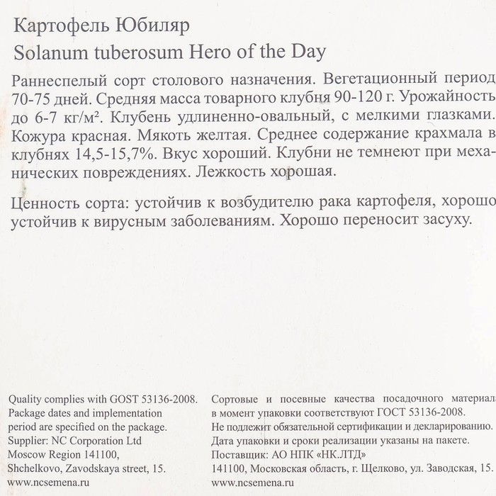 Юбиляр относится к раннеспелым сортам столового назначения. Его урожай можно собирать по 2 раза в год. Хорошо употребляет влагу почвы, особенно в начале лета. Кожура плотная, толстая, картошка хорошо хранится зимой. Разрастание ботвы происходит умеренно. Куст промежуточного типа, полупрямостоячий, стеблевой. По размеру высокий. Цветки достаточно крупные, внутренняя сторона венчика окрашена в антоциановый цвет. Синева либо мала, либо отсутствует. Листья по форме типичные для данной культуры. Расположены промежуточно. Без опушения, слабо морщинистые, крупные, цвет – насыщенно-зеленый.