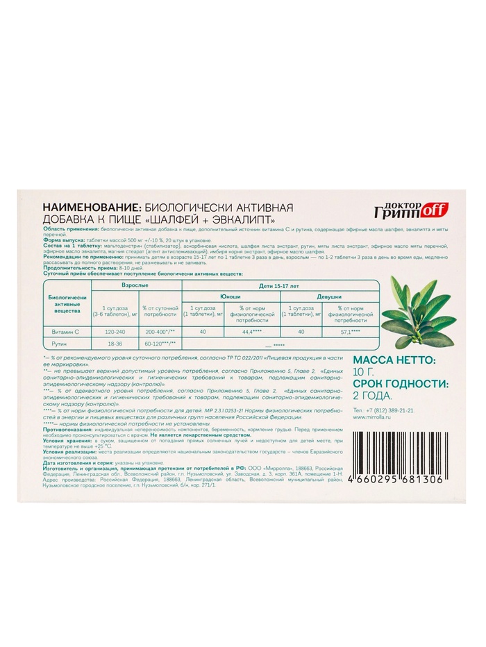 Шалфей + Эвкалипт «Доктор ГриппOFF», 20 таблеток