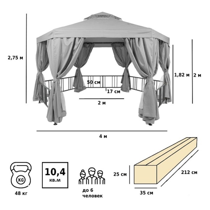 Размер: 2х2х2 м Вес нетто: 46 кг Высота конька: 2.75 м Материал: полиэстер 180 г с РА покрытием Каркас: стальная труба с порошковым покрытием; опора - 19х19/20х20 мм; ограждение - 20х30/15х15 мм; верх - 15х15 мм Соединительные элементы каркаса: сталь Цвет: серый Размер коробки: 212х35х25 см Вес брутто: 48 кг Производитель: Green Glade