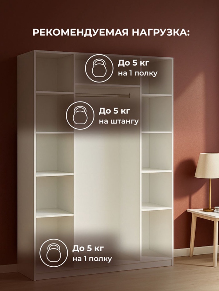 - Максимальная нагрузка на полку: 5 кг — оптимальна для хранения одежды, белья или декоративных предметов.