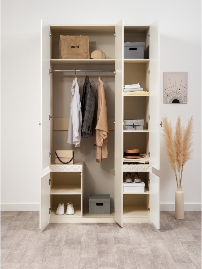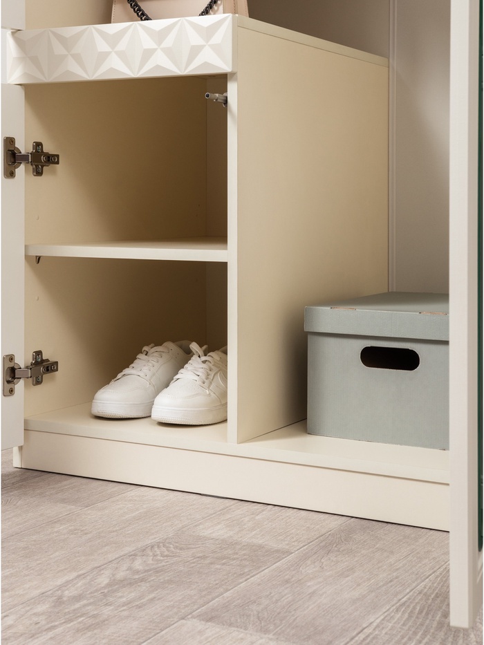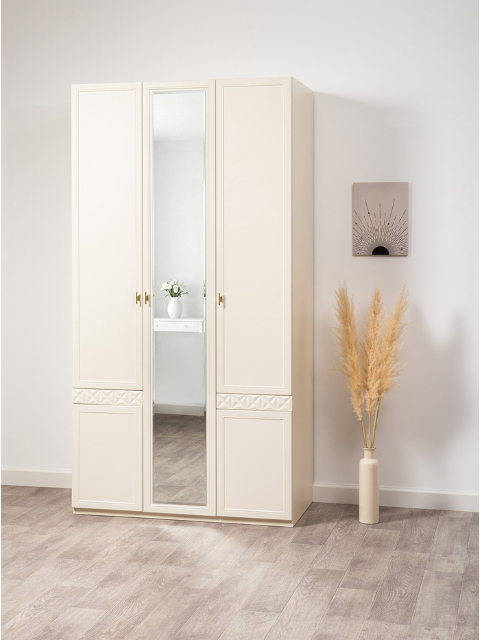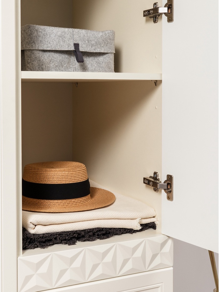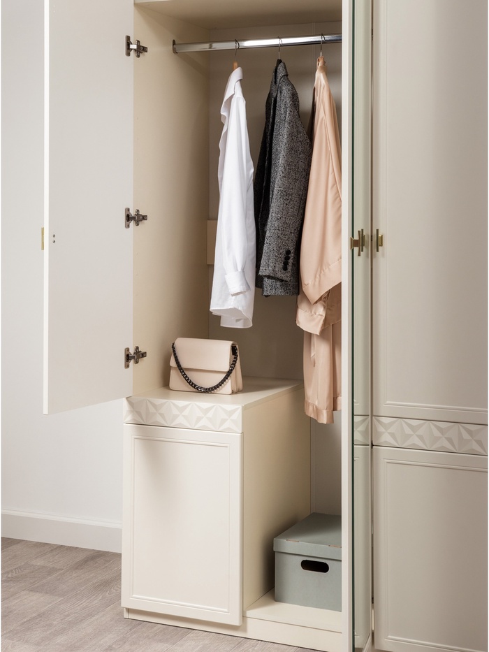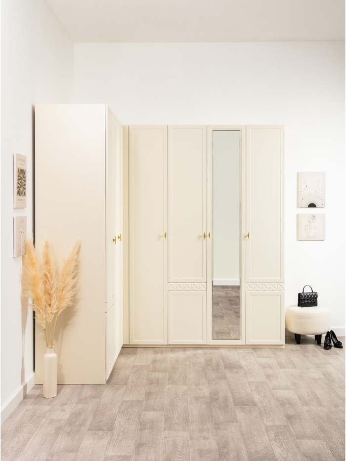 Фасады с глубокой фрезеровкой из МДФ подчёркивают классическую эстетику, а светлый оттенок «Слоновая кость» придаёт мебели лёгкость и визуально расширяет пространство. Нежная цветовая гамма делает шкаф универсальным и легко сочетаемым с различными интерьерными решениями.