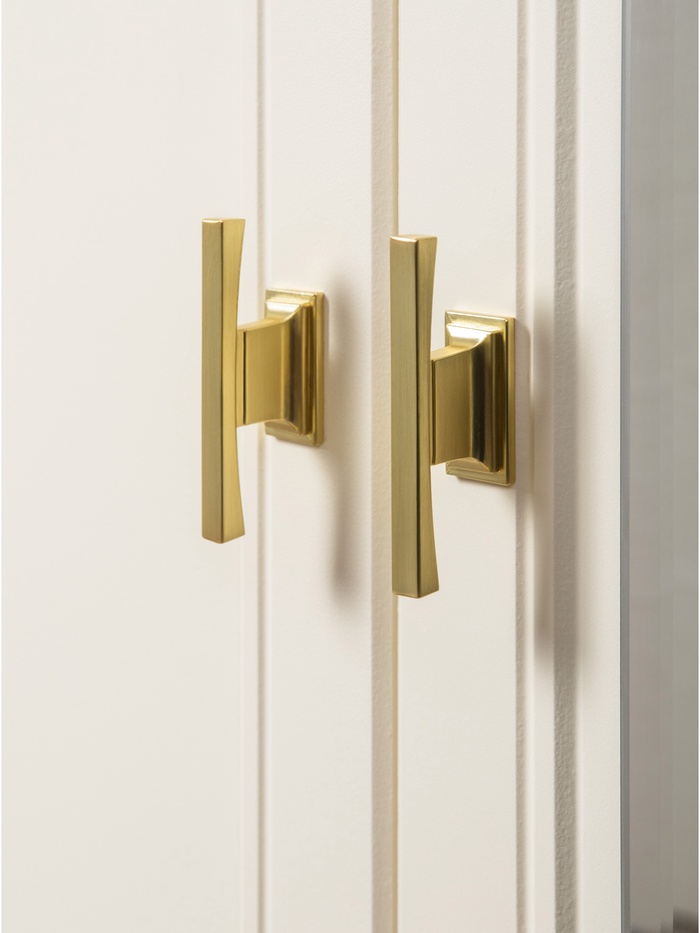 Металлические ручки и опоры золотого цвета создают изысканный акцент, а качественная фурнитура с доводчиками обеспечивает плавное и бесшумное закрытие дверей.