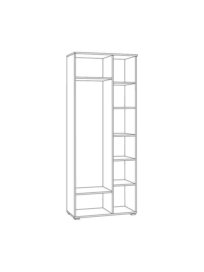 - Комбинированная система хранения: внутреннее наполнение включает полки для сложенных вещей и штангу для одежды на плечиках.