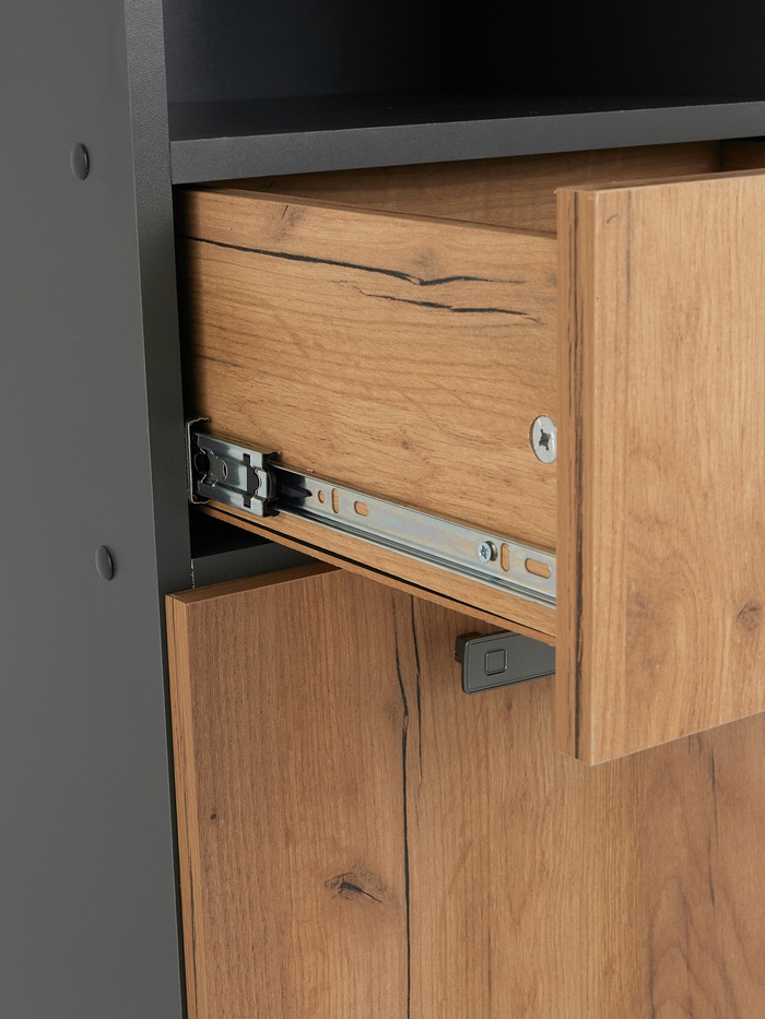- Комбинированная конструкция: закрытые секции, открытая полка и ящик для разного типа хранения
