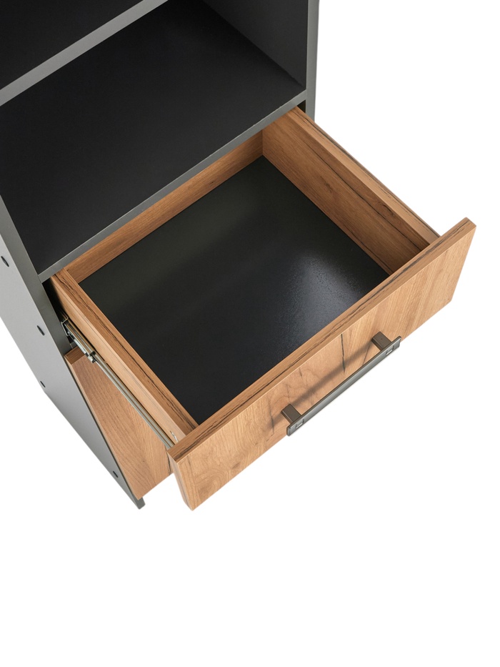 - Комбинированная конструкция: закрытые секции, открытая полка и ящик для разного типа хранения