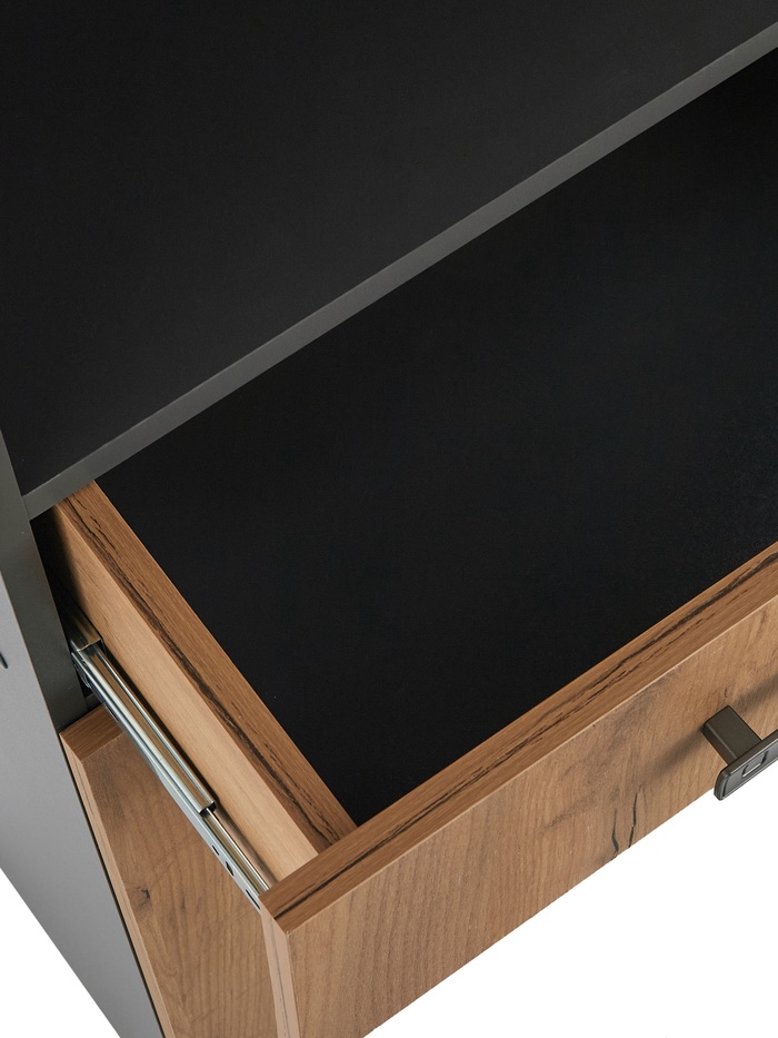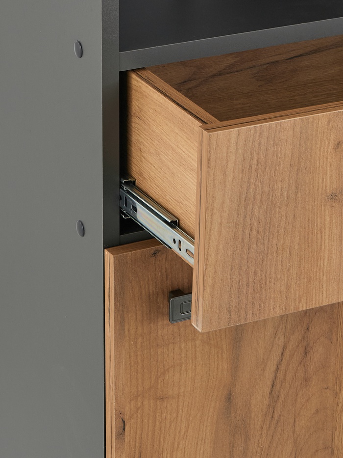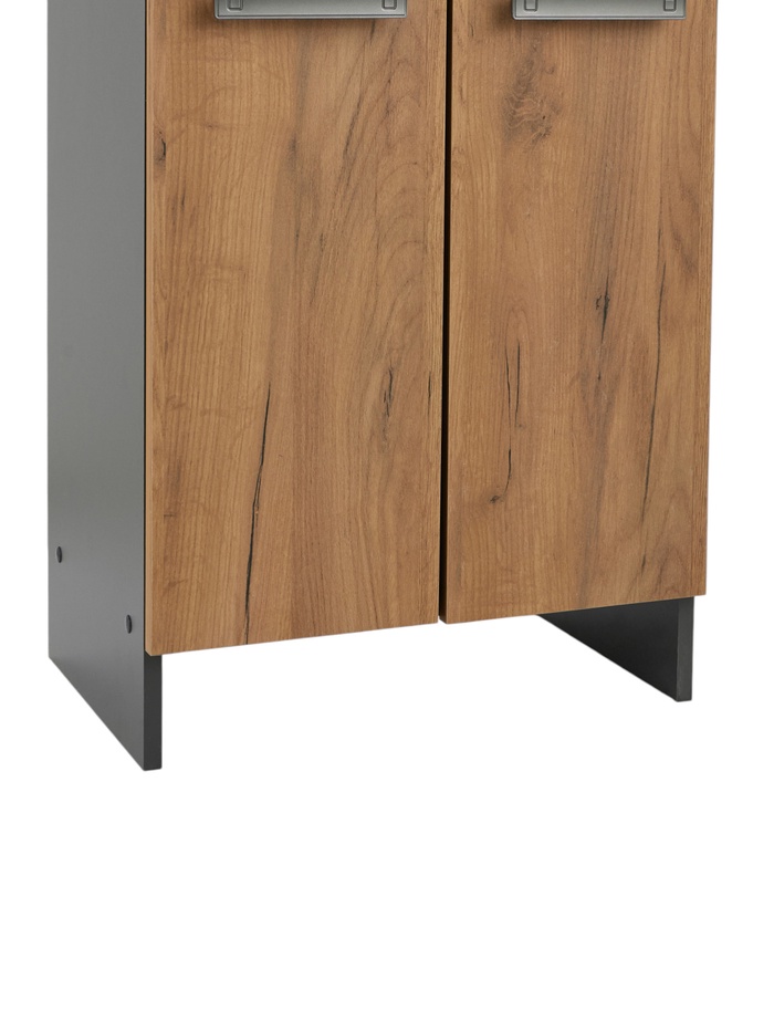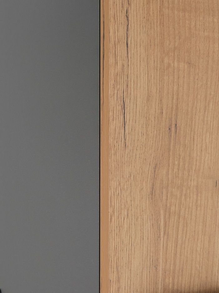 - Стильный акцент: контрастное сочетание графита и дуба золотого делает пенал не просто местом хранения, а самостоятельным декоративным элементом интерьера.