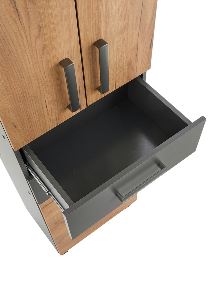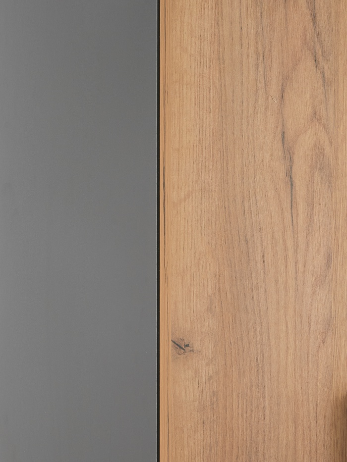 - Контрастный дизайн фасадов: сочетание графита и текстуры дуба добавляет визуальную глубину интерьеру