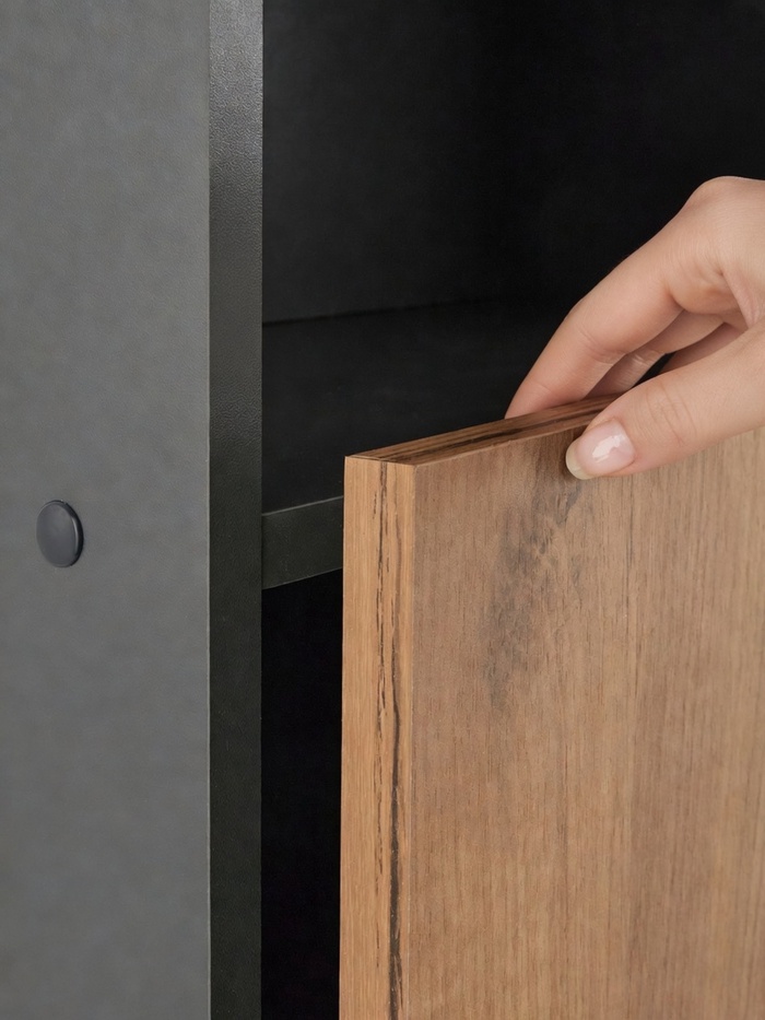 - Стильный акцент: контрастное цветовое решение делает пенал не просто местом хранения, а самостоятельным декоративным элементом интерьера.