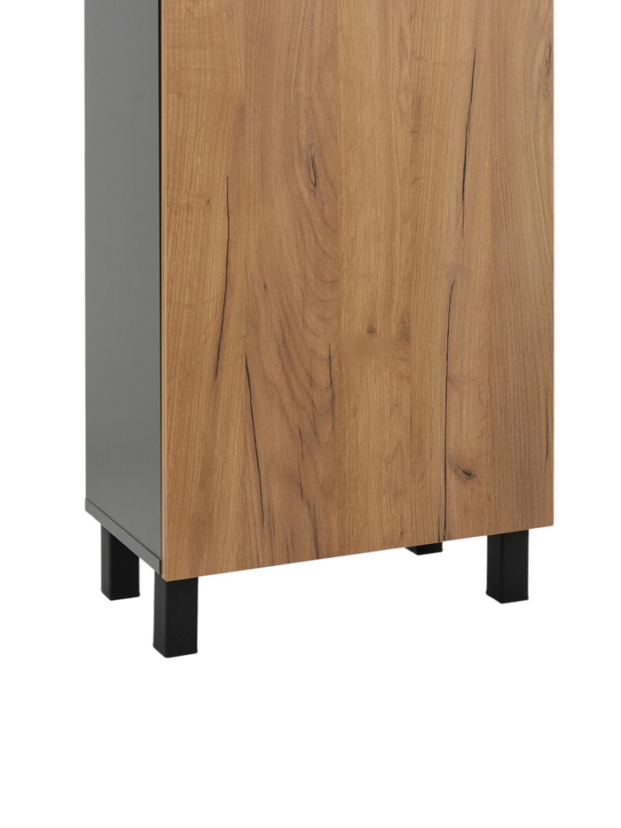 Стильное и функциональное решение для хранения в ванной комнате. Напольный шкаф-пенал выполнен в элегантном сочетании оттенков: благородный графит и тёплая текстура дуба золотого создают выразительный контраст, придающий интерьеру современный характер. Продуманная система хранения включает закрытое отделение за дверцами с внутренними полками, что позволяет аккуратно разместить полотенца, косметику, бытовую химию и другие принадлежности, скрывая их от посторонних глаз.