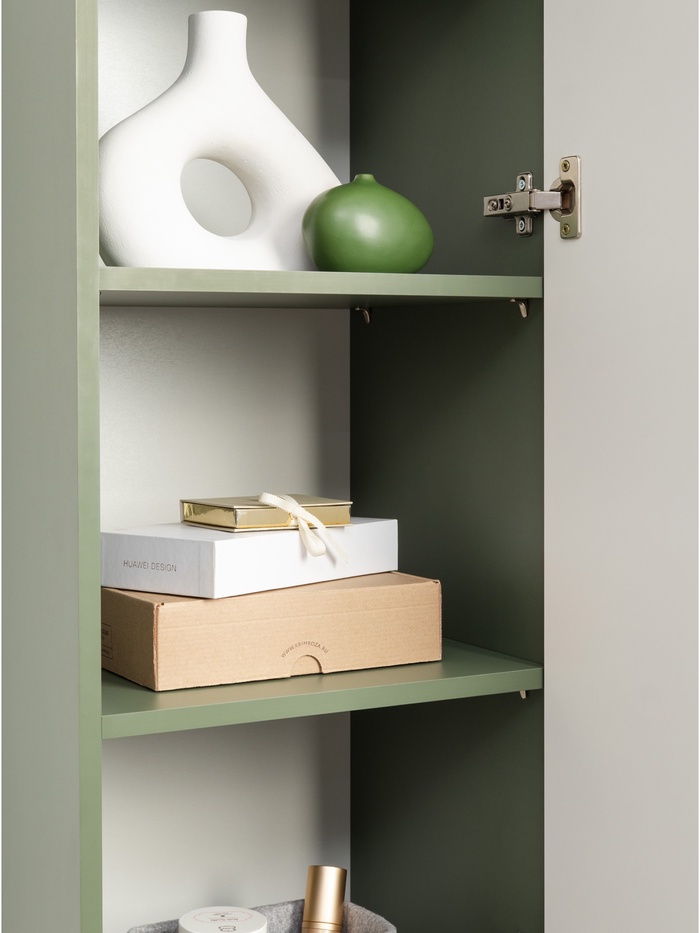Фасады с глубокой фрезеровкой из МДФ подчёркивают классический стиль, а благородное сочетание оттенков «Дымчатый зелёный» и «Олива шагрень» придаёт интерьеру глубину, уют и выразительность. Такое цветовое решение гармонично вписывается в современные и классические интерьеры.