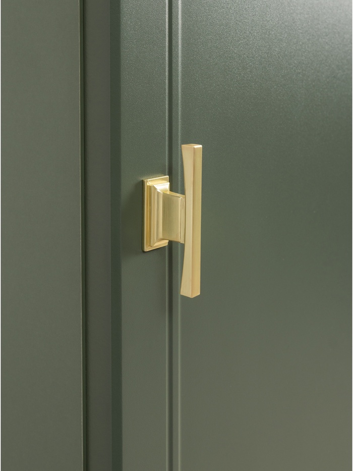 Металлические ручки и опоры золотого цвета добавляют изысканный акцент, а фурнитура с доводчиками обеспечивает плавное и бесшумное закрытие дверцы.