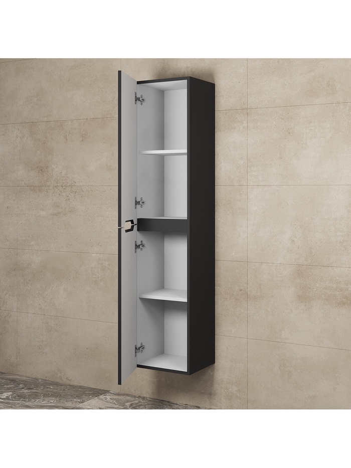 Компактное и функциональное решение для хранения в ванной комнате. Навесной шкаф-пенал выполнен в благородном чёрном цвете с матовым покрытием, которое придаёт мебели элегантность и современный характер. Универсальное открывание двери позволяет установить её как на левую, так и на правую сторону, адаптируя размещение под особенности помещения. Доводчик обеспечивает плавное и бесшумное закрывание, а внутренние полки позволяют удобно организовать хранение полотенец, косметики, бытовой химии и других принадлежностей.