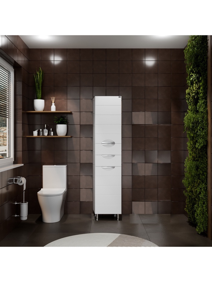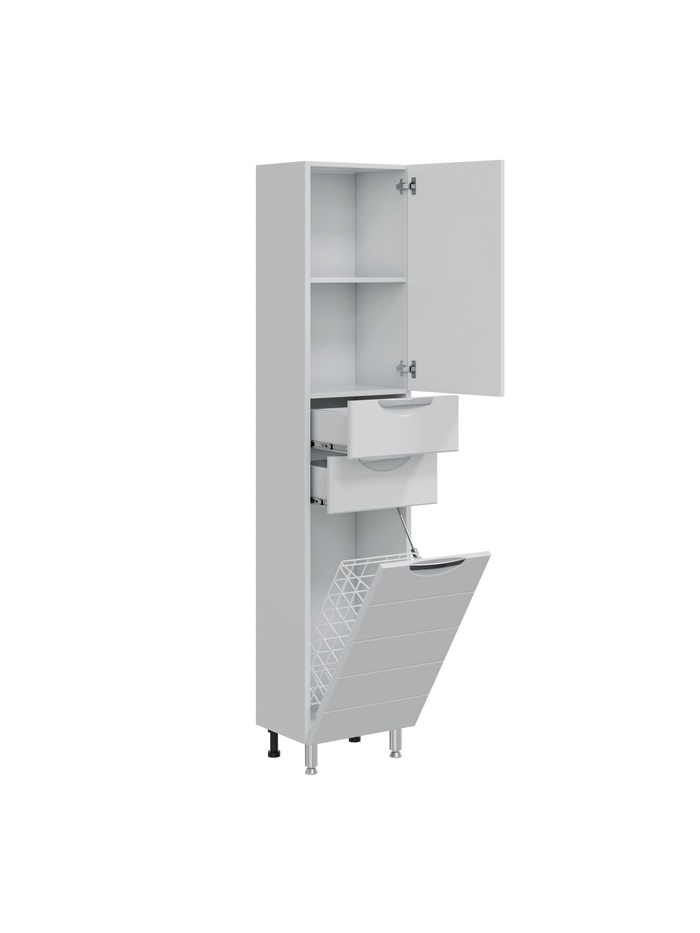Напольный шкаф-пенал для ванной комнаты с отделением для хранения белья. Предназначен для организации пространства и раздельного хранения бытовых принадлежностей и текстиля.