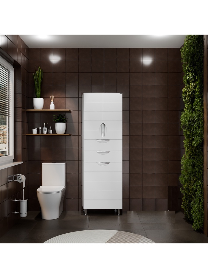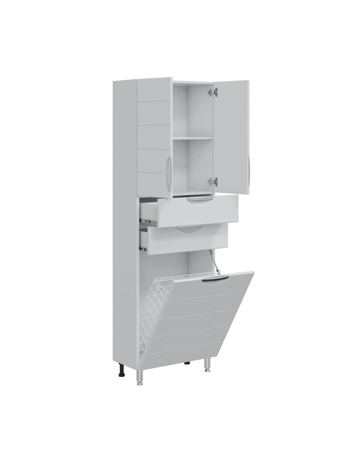 Напольный шкаф-пенал для ванной комнаты увеличенной ширины с отделением для хранения белья. Подходит для организации пространства и размещения бытовых принадлежностей в одном модуле.