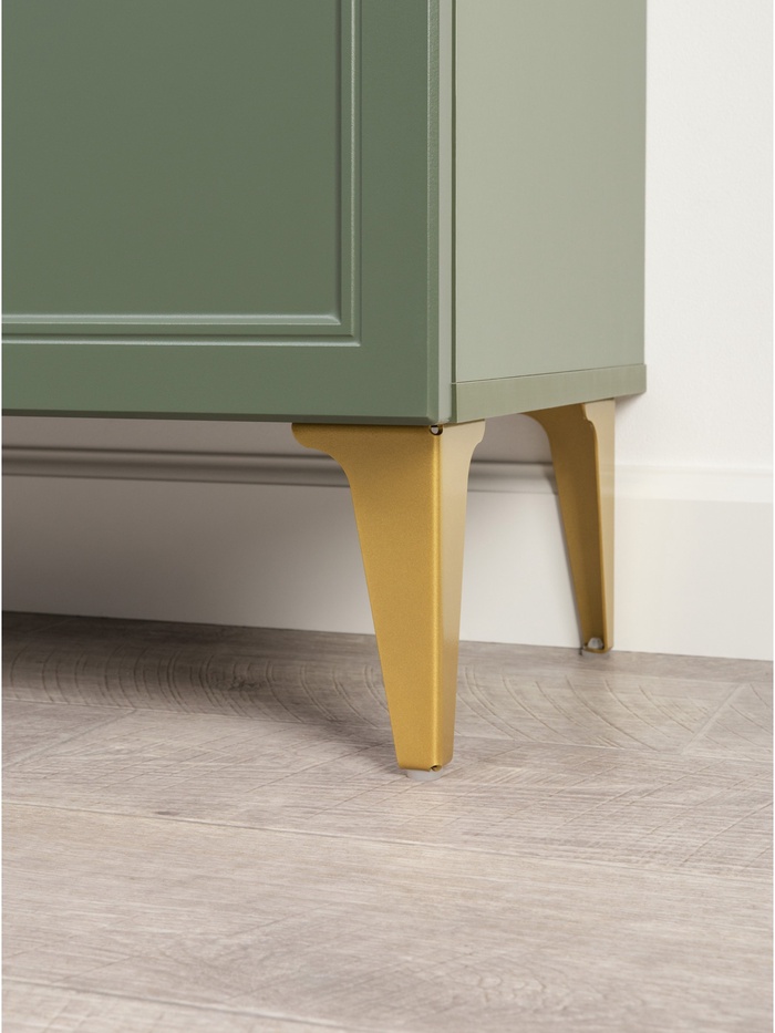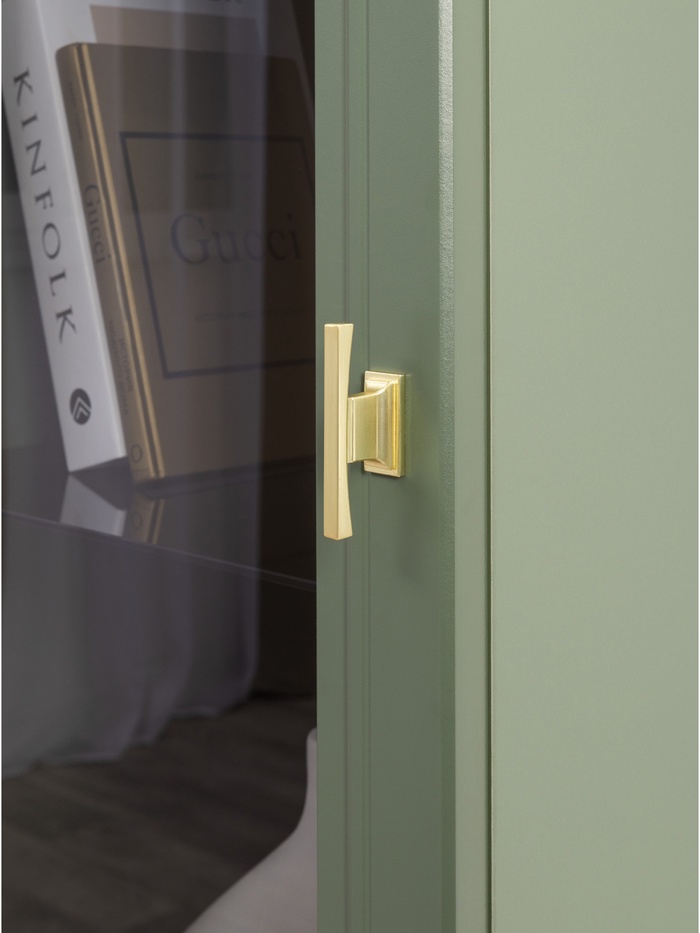 Металлические ручки и опоры золотого цвета придают мебели выразительный акцент, а фурнитура с доводчиками обеспечивает плавное и бесшумное закрытие дверей.