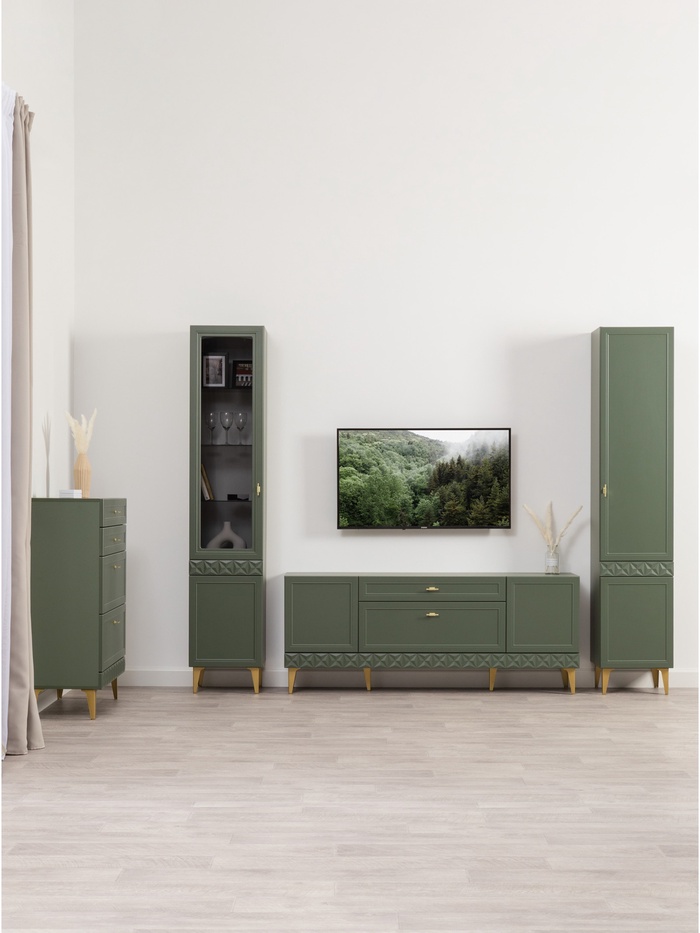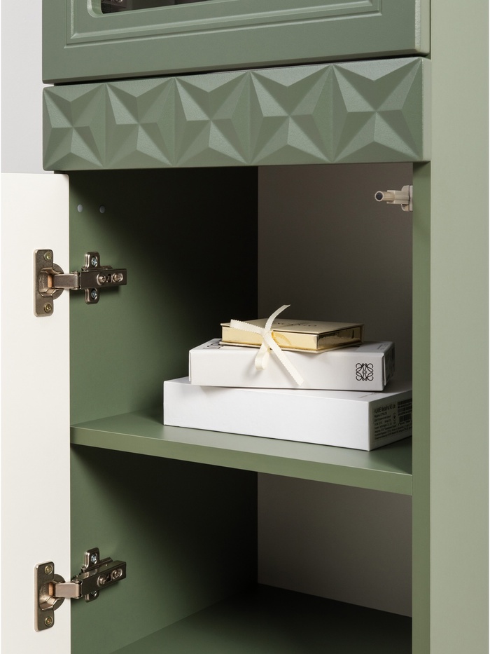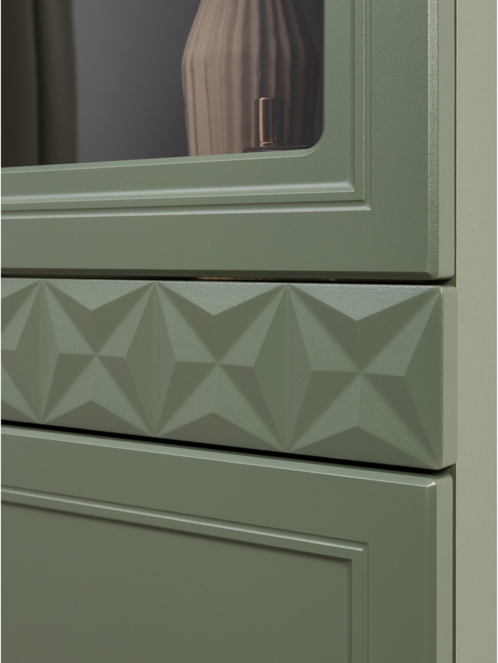 Фасады с глубокой фрезеровкой из МДФ подчёркивают классический стиль, а благородный оттенок «Олива шагрень» с насыщенным зелёным тоном создаёт атмосферу уюта и респектабельности. Тонированное закалённое стекло добавляет визуальной лёгкости и делает конструкцию более изящной.