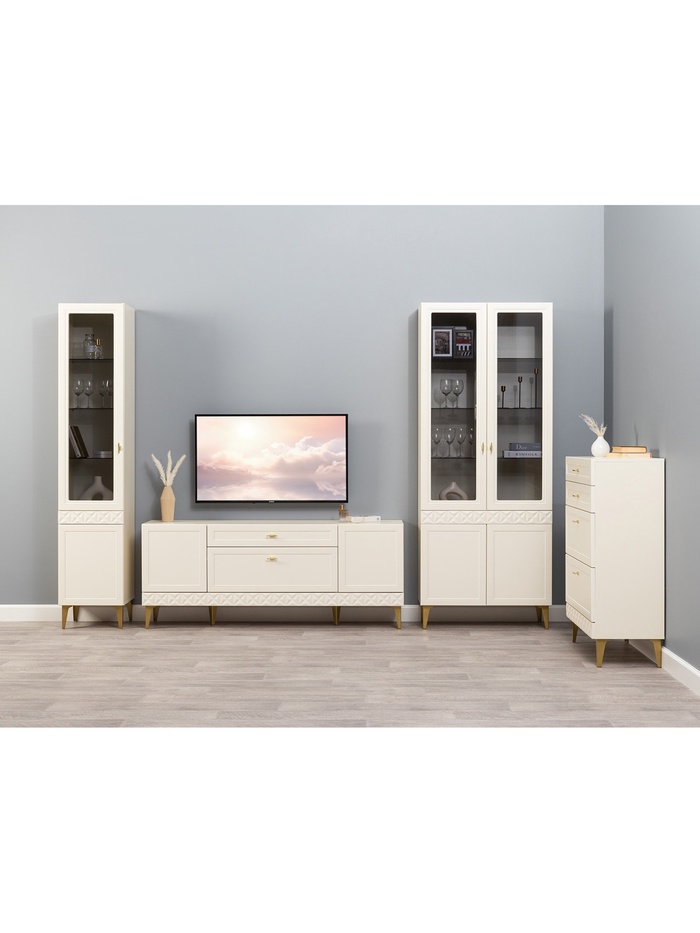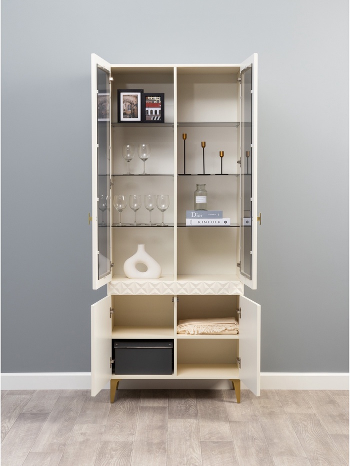 Шкаф-витрина «Марион» — элегантный элемент гостиной, который сочетает в себе функции хранения и демонстрации. Модель позволяет удобно разместить посуду, декоративные элементы и аксессуары, придавая интерьеру лёгкость и утончённость.