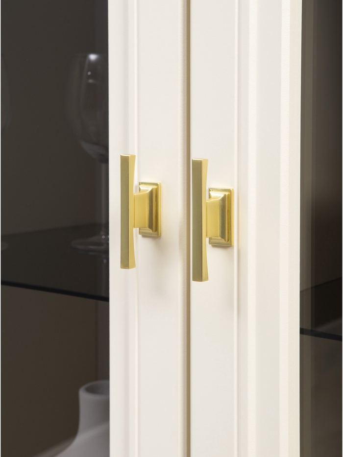 Металлические ручки и опоры золотого цвета придают мебели выразительный акцент, а фурнитура с доводчиками обеспечивает плавное и бесшумное закрытие дверей.