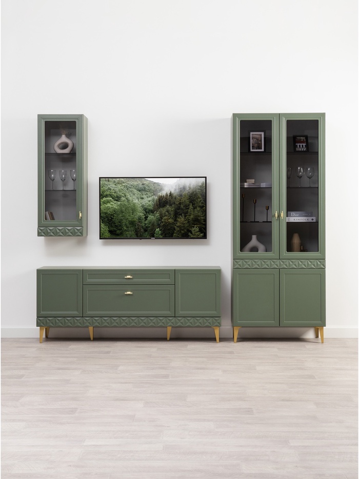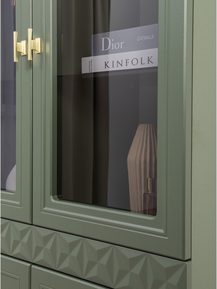 Фасады с глубокой фрезеровкой из МДФ подчёркивают классический дизайн, а благородное сочетание оттенков «Дымчатый зелёный» и «Олива шагрень» придаёт интерьеру глубину и выразительность. Тонированное закалённое стекло добавляет визуальной лёгкости и делает конструкцию более изящной и современной.