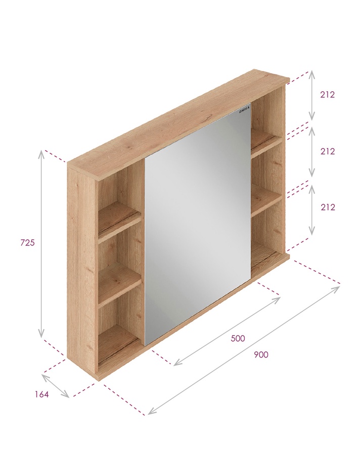 Технические характеристики Зеркало – шкаф Onika «Легран 90», универсальный, 900×164×725 мм, цвет дуб галифакс