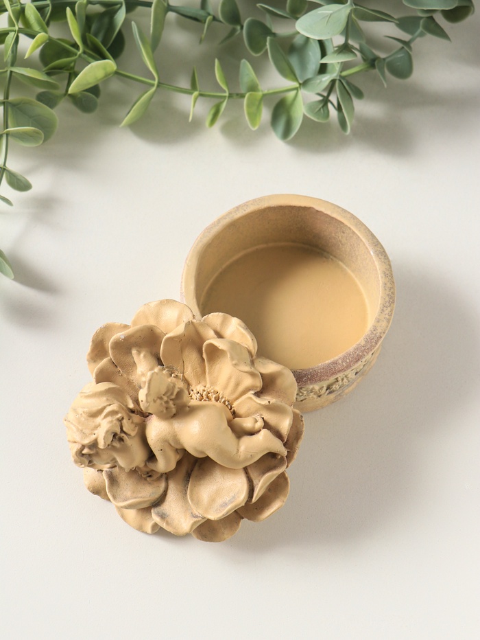 Эта изящная шкатулка в форме цветка — место, где ваши драгоценности обретают покой и защиту. Нежный бежевый оттенок и мягкие линии создают атмосферу умиротворения, превращая простой аксессуар для хранения в предмет интерьера с особой душой. Миниатюрный ангел, притаившийся в сердцевине, напоминает о самом сокровенном.