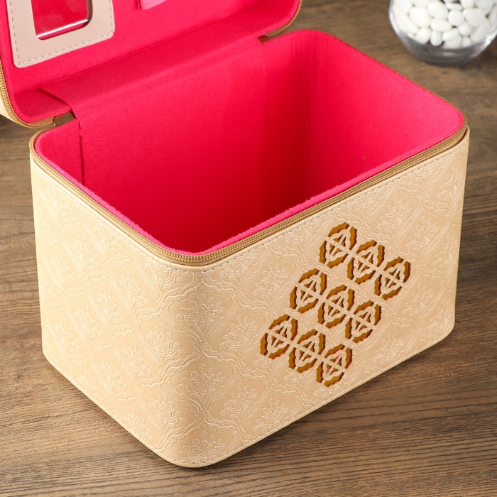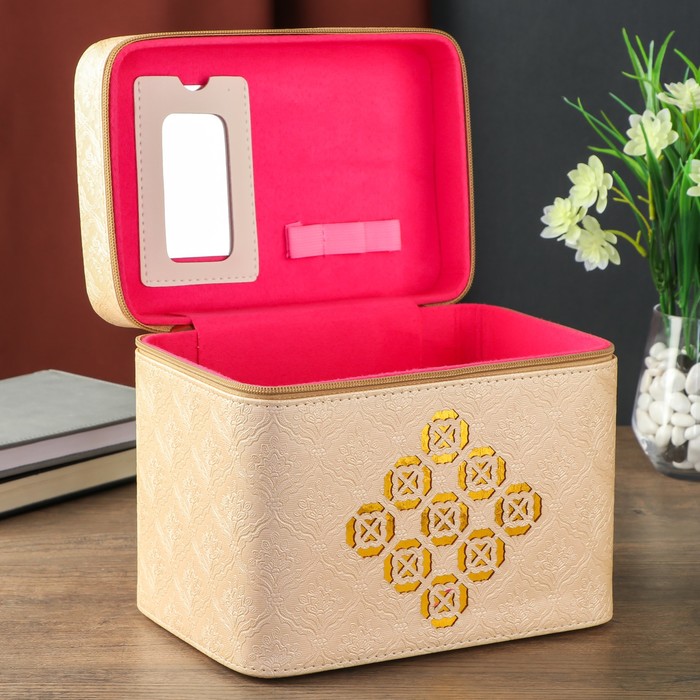 Шкатулка кожзам с зеркалом "Золотые символы" молочная 19,5х16,5х23 см