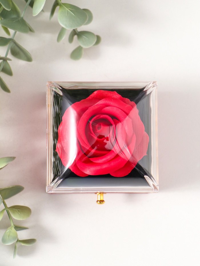 Эта красная шкатулка для драгоценностей — элегантный способ хранить и организовывать ваши украшения. Компактный квадратный футляр с выдвижным ящиком легко поместится на туалетном столике или в дорожной сумке. Изящная фигурка розы на крышке придаёт ему романтичный и нежный вид, делая шкатулку не просто органайзером, а самостоятельным украшением интерьера.