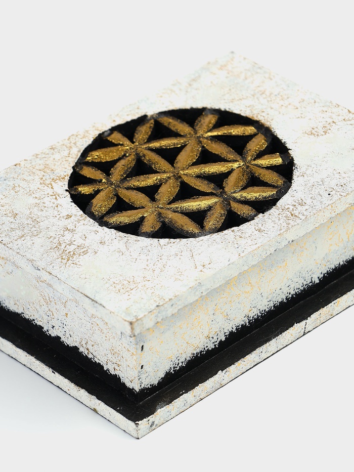 - Белый фон с цветами: Деликатный рисунок на белой поверхности добавляет шкатулке женственности, не перегружая дизайн.