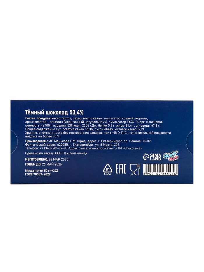 Технические характеристики Шоколад темный «Санта с письмом», 50 г